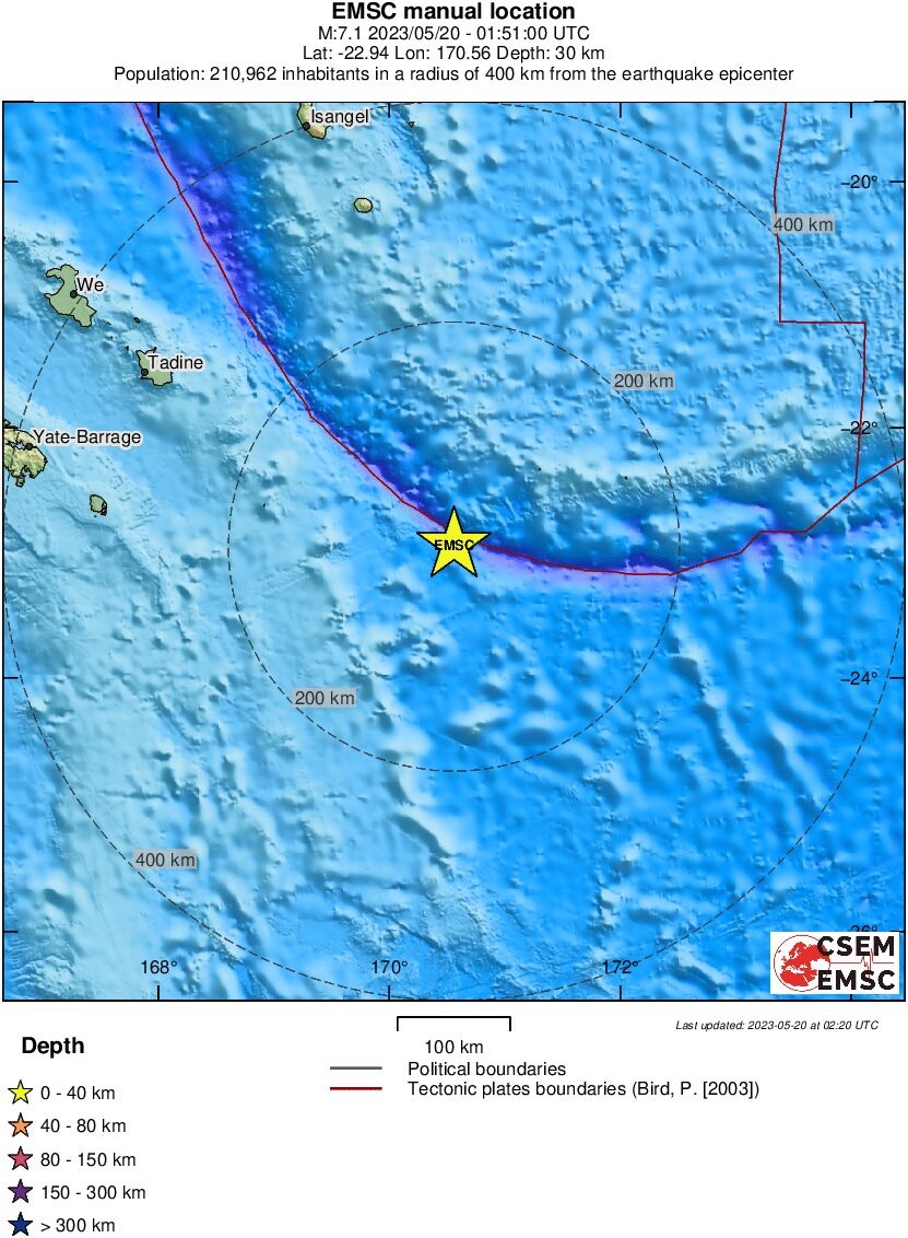 Σεισμική δόνηση 7,1 βαθμών σημειώθηκε σήμερα (20/5) στον Ειρηνικό Ωκεανό, νοτιοανατολικά της Νέας Καληδονίας.