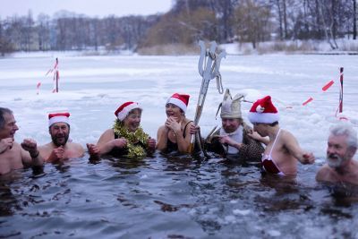 Μέλη του κολυμβιτικού συλλόγου ‘Seehunde Berlin’, γιορτάζουν τα Χριστούγεννα στη παγωμένη λίμνη Οράνκεστο Βερολίνο το Σάββατο. Κάθε Χριστούγεννα ο σύλλογος διοργανώνει Χριστουγεννιάτικο κολύμπι στη λίμνη.