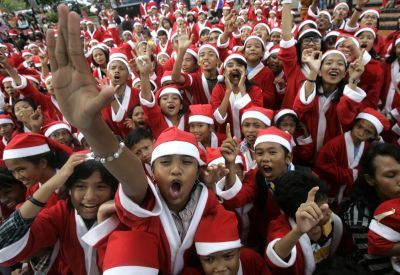Ινδονήσιοι νέοι ντυμένοι Αγιοβασίληδες σε Χριστουγεννιάτικη γιορτή στη Τζακάρτα.