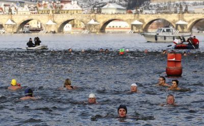 Χειμερινοί κολυμβητές σε χριστουγεννιάτικο παραδοσιακό κολύμπι στην Πράγα.