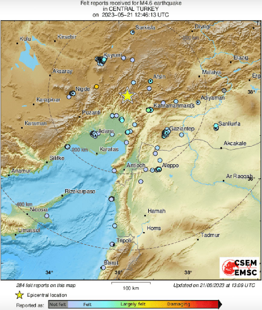 Σεισμός μεγέθους 4,6 βαθμών σημειώθηκε στα Άδανα της Τουρκίας, σύμφωνα με το Ευρωμεσογειακό Ινστιτούτο.