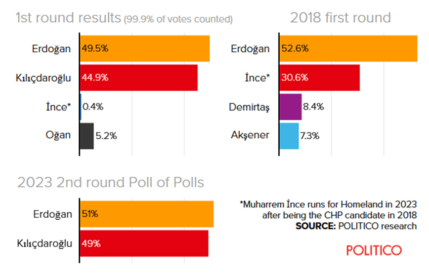 Νίκη του Ερντογάν προβλέπει και το Politico, που συγκεντρώνει όλες τις μετρήσεις, βγάζοντας μια τελική εκτίμηση. Συγκεκριμένα το «poll of polls» του Politico δείχνει νίκη του Ρετζέπ Ταγίπ Ερντογάν με 51% έναντι 49% του Κεμάλ Κιλιτσντάρογλου.