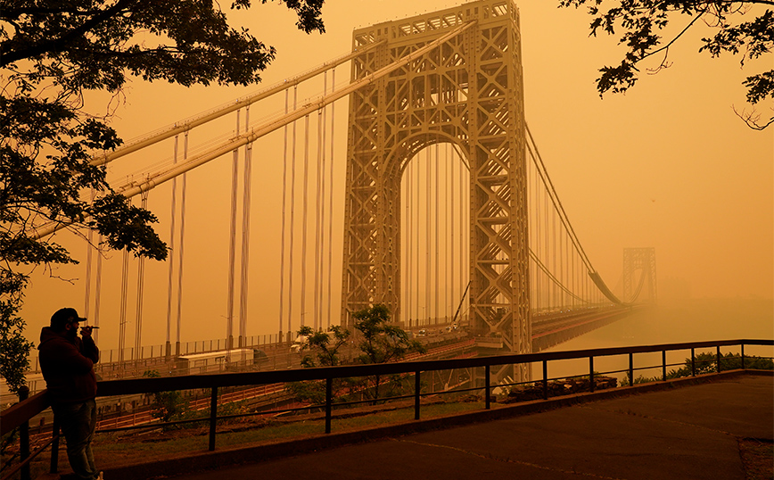 Οι πυρκαγιές στον Καναδά έχουν γεμίσει καπνό τις βορειοανατολικές ΗΠΑ, καθιστώντας την ατμόσφαιρα αποπνικτική. Η γέφυρα George Washington, που ενώνει το Νιού Τζέρσει με το Μανχάταν, μοιάζει σαν να οδηγεί σε μια χαμένη πόλη, χωμένη μέσα στον καπνό.