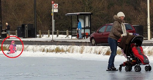 Όπως φαίνεται από τη φωτογραφία η μητέρα έχει πάρει το καροτσάκι με το μωρό της και κάνει πατινάζ. Το πρόβλημα είναι ότι το σκηνικό δεν εκτυλίσσεται σε κάποιο οργανωμένο παγοδρόμιο αλλά σε μία λίμνη στο Βόρειο Λονδίνο που έχει παγώσει.