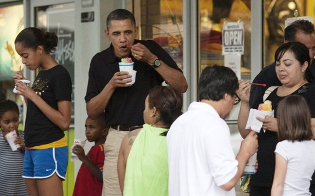 Ο Πρόεδρος της Αμερικής την Δευτέρα απόλαυσε οικογενειακές στιγμές αφού έπαιξε μπάσκετ και μπόουλινγκ με τις κόρες του και φίλους. Στη συνέχεια πήγε σε ένα γνωστό μαγαζί με παγωτά της περιοχής και απόλαυσε ένα μεγάλο παγωτό.