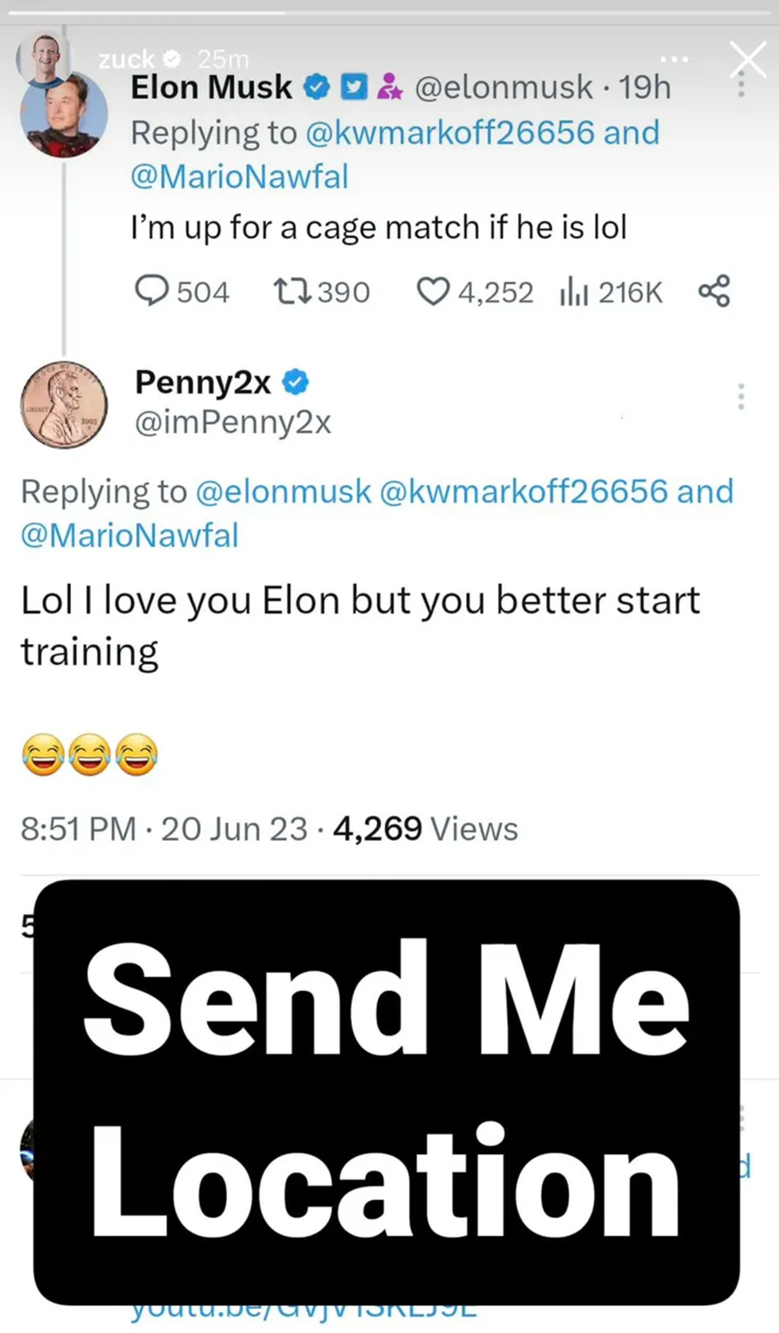 O Έλον Μασκ έγραψε πρόσφατα στο Twitter ότι θα ήταν «έτοιμος για μια μάχη στο κλουβί» με τον Ζούκερμπεργκ και ο Διευθύνων Σύμβουλος της Meta απάντησε αναρτώντας ένα printscreen του tweet του Μασκ με τη λεζάντα «στείλε μου τοποθεσία».
