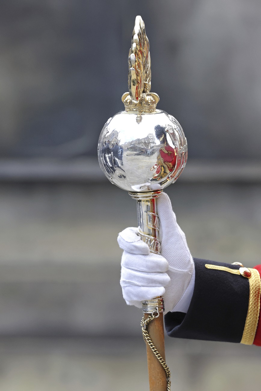 Επίσης, έλαβε το σκήπτρο και το στέμμα από τις τιμές της Σκωτίας, μαζί με το νέο σπαθί της Ελισάβετ, το οποίο μετέφερε η Ολυμπιονίκης κωπηλάτης Κάθριν Γκρέινγκερ.