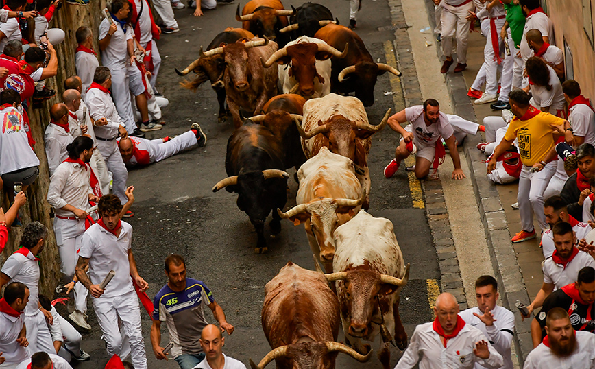 Οι ταύροι της La Palmosilla τρέχουν ανάμεσα στους λάτρεις των ταυρομαχιών που παρευρέθηκαν στον αγώνα, κατά τη διάρκεια της πρώτης ημέρας του τρεξίματος των ταύρων στη γιορτή του Σαν Φερμίν στην Παμπλόνα της Ισπανίας.