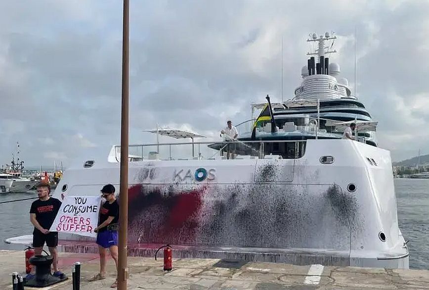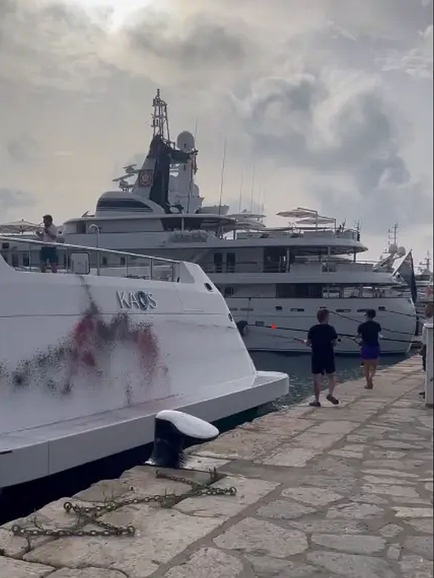 Δύο μέλη της ομάδας, στόχευσαν το μέγα γιοτ «Kaos» και χρησιμοποιώντας πυροσβεστήρες έριξαν μπογιές στο πολυτελές σκάφος όπως βλέπετε και στις παρακάτω φωτογραφίες.