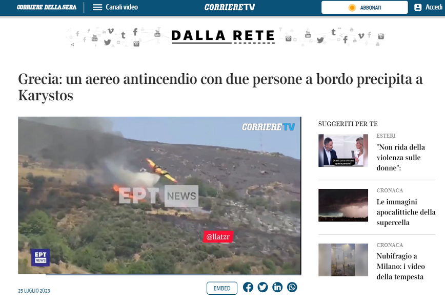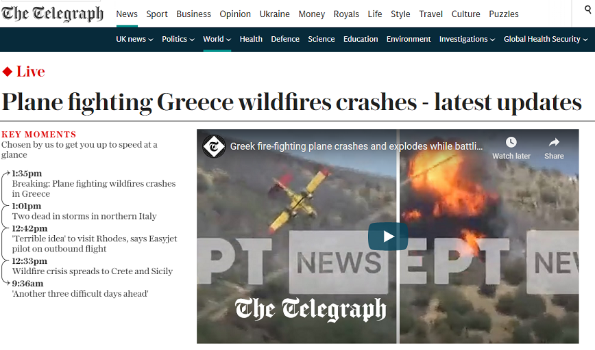 Το γύρο του κόσμου κάνει η τραγική είδηση ότι συνετρίβη καναντέρ κατά τη διάρκεια κατάσβεσης φωτιάς στην Κάρυστο, με αρκετά ΜΜΕ του εξωτερικού να αναφέρονται στο γεγονός.