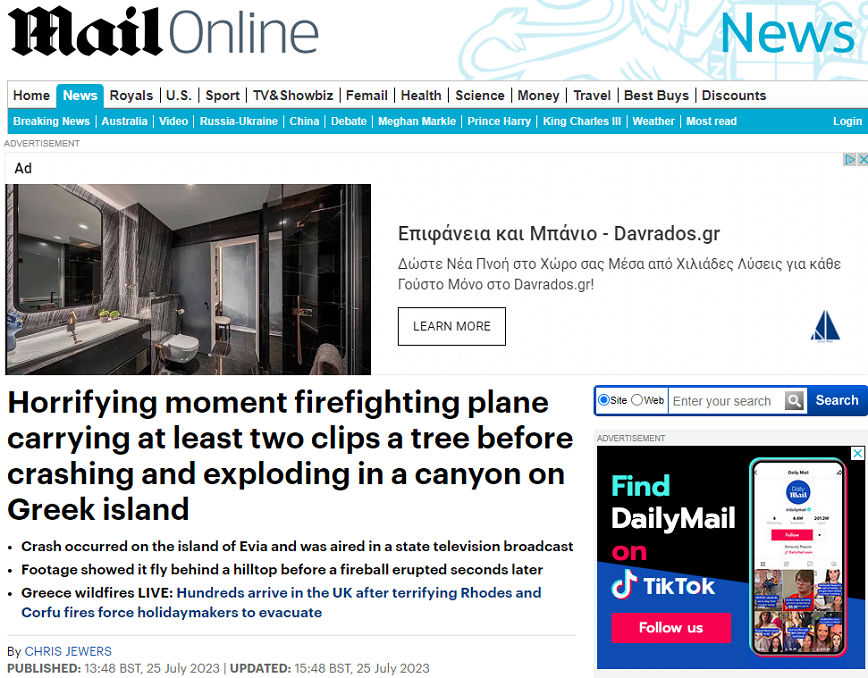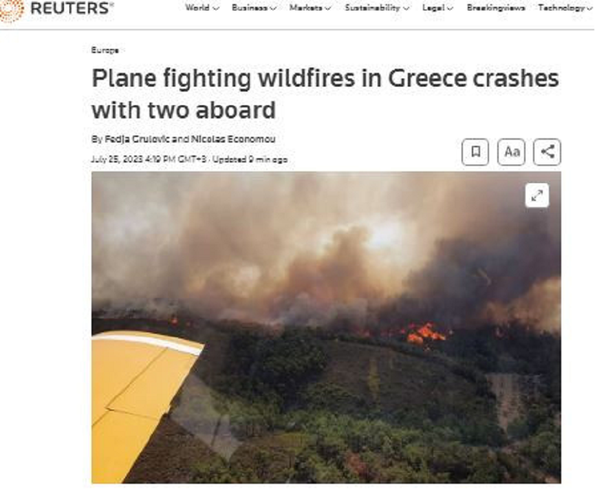 «Αεροπλάνο που καταπολεμά τις πυρκαγιές στην Ελλάδα συνετρίβη με δύο επιβαίνοντες»