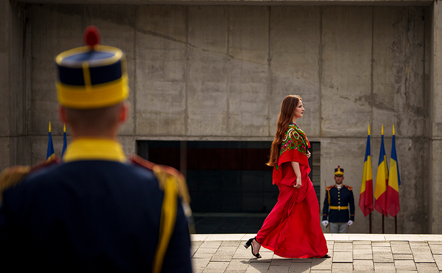 Την Ημέρα Μνήμης του Ολοκαυτώματος των Ρομά γιόρτασε η Ρουμανία, έξω από το μνημείο του Ολοκαυτώματος, στο Βουκουρέστι. Η εκδήλωση σηματοδοτεί τα δεινά των Ρουμάνων Ρομά του Β Παγκοσμίου Πολέμου, όταν, σύμφωνα με τη Μελέτη του Ολοκαυτώματος στη Ρουμανία, 50.000 Ρομά απελάθηκαν στη Σοβιετική Ένωση και 11.000 από αυτούς πέθαναν. Στη φωτογραφία, η Ρουμάνα Ρομά σοπράνο Isabela Stanescu περπατά δίπλα σε στρατιώτες της τιμητικής φρουράς για να εκτελέσει τον ύμνο των Ρομά «Gelem, Gelem» κατά τη διάρκεια του εορτασμού.