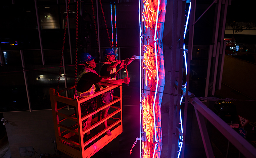 Εργάτες αφαιρούν μια πινακίδα neon που κρέμεται στο κτίριο εστιατορίου από το 1964 στο Χονγκ Κονγκ. Οι εμβληματικές επιγραφές neon που κάποτε ήταν πανταχού παρούσες στους δρόμους του Χονγκ Κονγκ, εξαφανίζονται λόγω των αυστηρότερων κυβερνητικών κανονισμών.