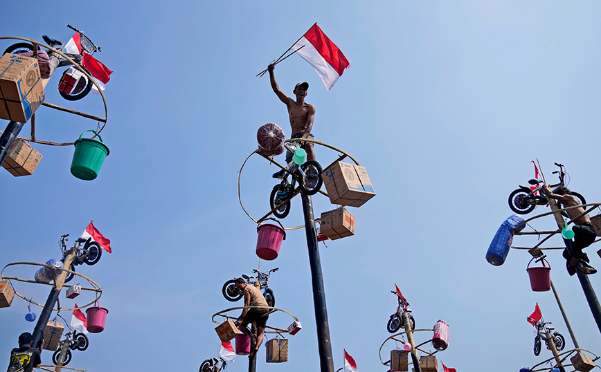 Με την Ινδονησία να γιορτάζει την 78η ανεξαρτησία της από την ολλανδική αποικιοκρατία, οι εορτασμοί στη χώρα ήταν ξέφρενοι. Στη φωτογραφία, ένας συμμετέχων πανηγυρίζει αφού έφτασε στα βραβεία κατά τη διάρκεια ενός διαγωνισμού αναρρίχησης σε λιπαρό στύλο που πραγματοποιήθηκε στο πλαίσιο των εορτασμών για την Ημέρα Ανεξαρτησίας στην παραλία Άνκολ στην Τζακάρτα της Ινδονησίας.