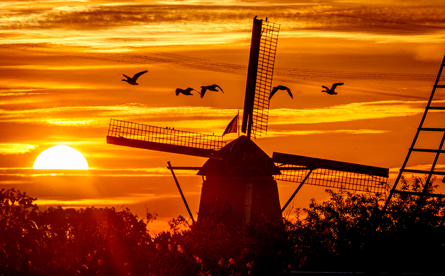 Χήνες πετούν δίπλα σε μια αντλία ανέμου στο Kinderdijk της Ολλανδίας, καθώς ο ήλιος πέφτει, δημιουργώντας το γλυκόπικρο συναίσθημα της χαρμολύπης στη θέα ενός ηλιοβασιλέματος. Περίπου το ένα τρίτο της χώρας βρίσκεται κάτω από τη στάθμη της θάλασσας και οι αντλίες ανέμου εμποδίζουν τις περιοχές να πλημμυρίσουν.