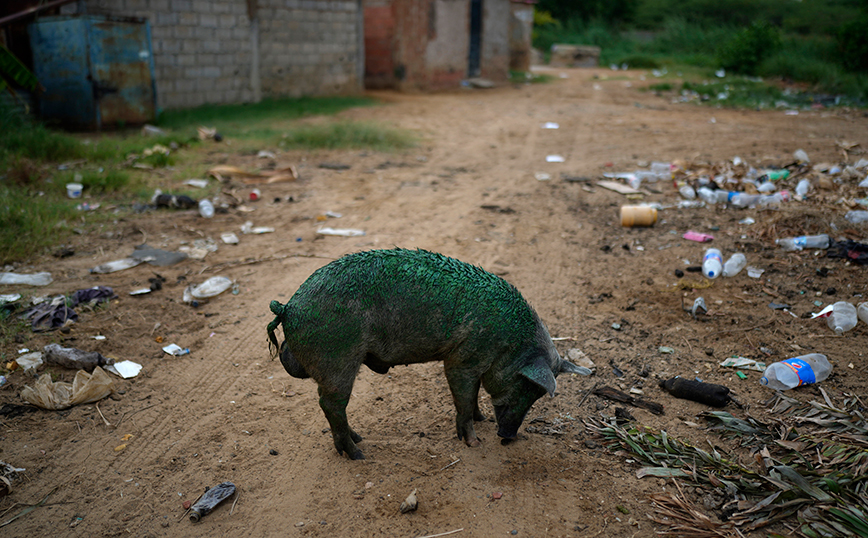 Ένα γουρούνι, επικαλυμμένο με μια παχιά πρασινωπή μεμβράνη που αναπτύσσεται στη λίμνη, μυρίζει το έδαφος ενώ αναζητά τροφή κοντά στην όχθη της λίμνης Μαρακαΐμπο της Βενεζουέλας. Η ρύπανση γύρω από τη λίμνη, μια από τις μεγαλύτερες της Λατινικής Αμερικής, είναι αποτέλεσμα δεκαετιών υπερβολικής εκμετάλλευσης πετρελαίου στον πυθμένα της, ανεπαρκούς συντήρησης και έλλειψης επενδύσεων για τη βελτίωση μιας ήδη απαρχαιωμένης υποδομής, σύμφωνα με τους περιβαλλοντολόγους.