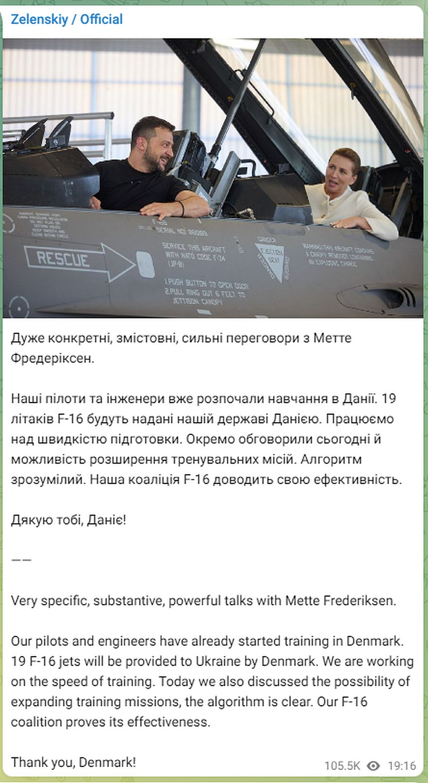 Οι πιλότοι και οι μηχανικοί μας έχουν ήδη ξεκινήσει την εκπαίδευση στη Δανία. 19 αεροσκάφη F-16 θα παραχωρηθούν στην Ουκρανία από τη Δανία. Δουλεύουμε για την ταχύτητα της εκπαίδευσης. Σήμερα συζητήσαμε επίσης τη δυνατότητα επέκτασης των εκπαιδευτικών αποστολών, ο αλγόριθμος είναι ξεκάθαρος. Ο συνασπισμός μας των F-16 αποδεικνύει την αποτελεσματικότητά του.