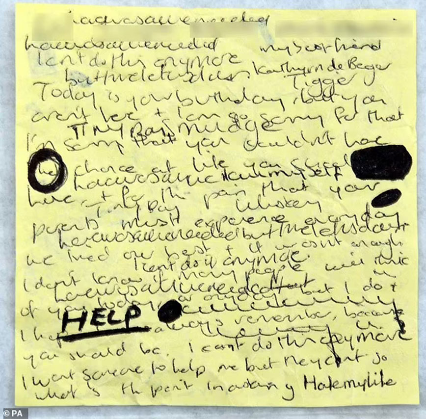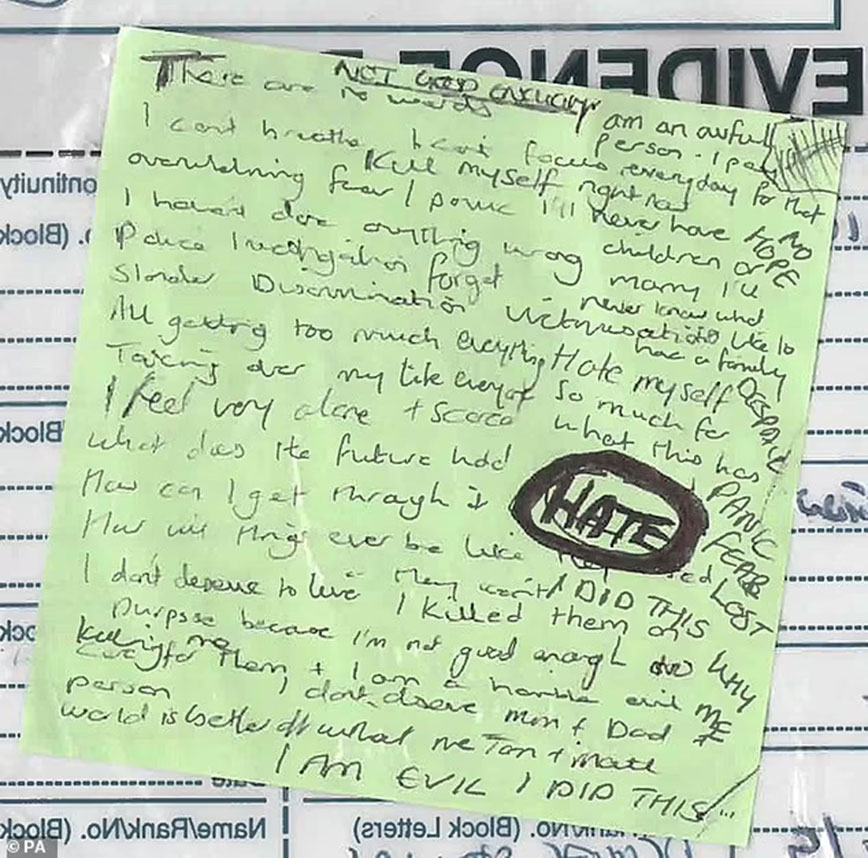 Όπως ανέφερε η Daily Mail, αν και στη δίκη αρνήθηκε τις κατηγορίες στο σπίτι της βρέθηκαν χειρόγραφες σημειώσεις στις οποίες παραδεχόταν τα φρικτά εγκλήματά της: «Τα σκότωσα επίτηδες γιατί δεν είμαι αρκετά καλή για να τα φροντίζω. Δεν θα κάνω ποτέ παιδιά ούτε θα παντρευτώ ούτε θα μάθω πώς είναι να κάνεις οικογένεια», «Είμαι ένας φρικτός, διαβολικός άνθρωπος» και «είμαι διαβολική, εγώ το έκανα αυτό».