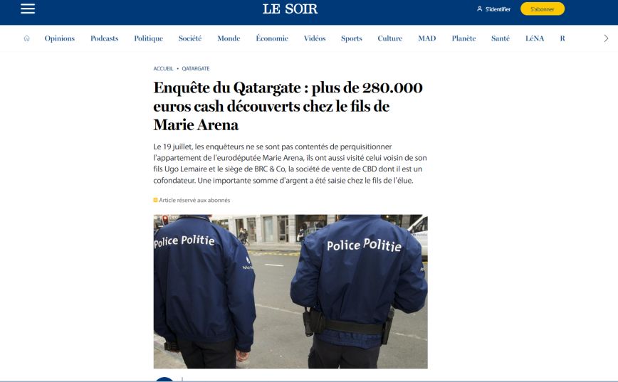 «Έρευνα Qatargate: πάνω από 280.000 ευρώ μετρητά εντοπίστηκαν στο σπίτι του γιου της Μαρί Αρένα» είναι ο τίτλος του άρθρου. ‘Όπως επισημαίνει, στις 19 Ιουλίου, οι ερευνητές όχι μόνο έλεγχξαν το διαμέρισμα της ευρωβουλευτή Μαρί Αρένα, επισκέφτηκαν επίσης το γειτονικό διαμέρισμα του γιου της Ούγκο Λεμέρ και τα κεντρικά γραφεία της BRC & Co, της οποίας είναι συνιδρυτής.
