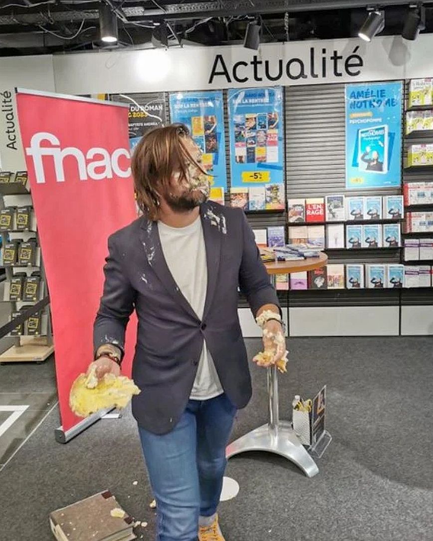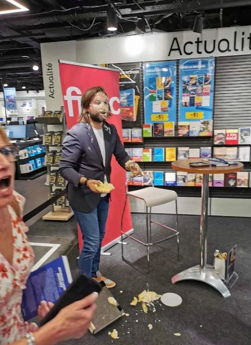 Ένας άνδρας έριξε τάρτα στο πρόσωπο του ηγέτη του φιλελεύθερου κόμματος της Βαλλονίας MR, Ζορζ-Λουί Μπουσέ ενώ υπέγραφε το νέο του βιβλίο σε κατάστημα της Λιέγης στο Βέλγιο.